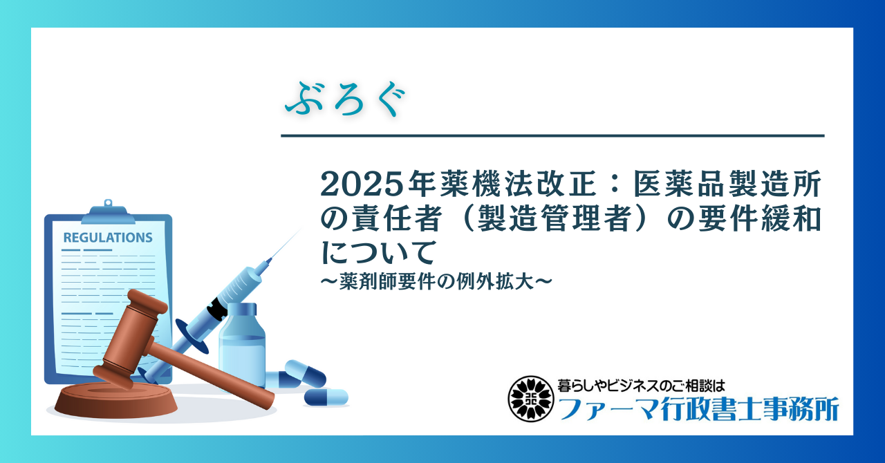 📌 ファーマ行政書士事務所では、薬機法改正対応や薬事に関する法令対応についてのご相談を承っています。本ブログのような法改正に伴う手順書の見直しや、製造管理者等の変更届出等の手続きもサポートしております。お気軽にご相談ください。