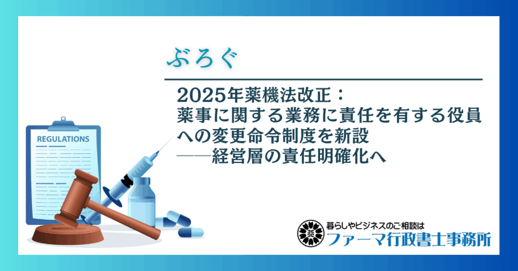 📌 ファーマ行政書士事務所では、薬機法改正対応に向けた経営層・責任者の役割整理、監督体制構築、社内規程改訂のご支援を行っています。